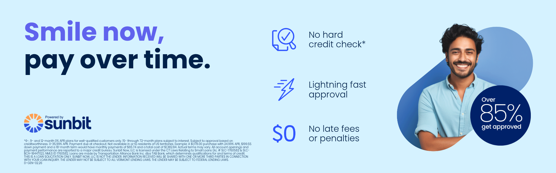 We offer Sunbit flexible payment plans to help make dental care more affordable by breaking your treatment cost into easy monthly payments. With a fast, simple application and transparent terms, Sunbit gives you the flexibility to choose a payment plan that fits your budget.